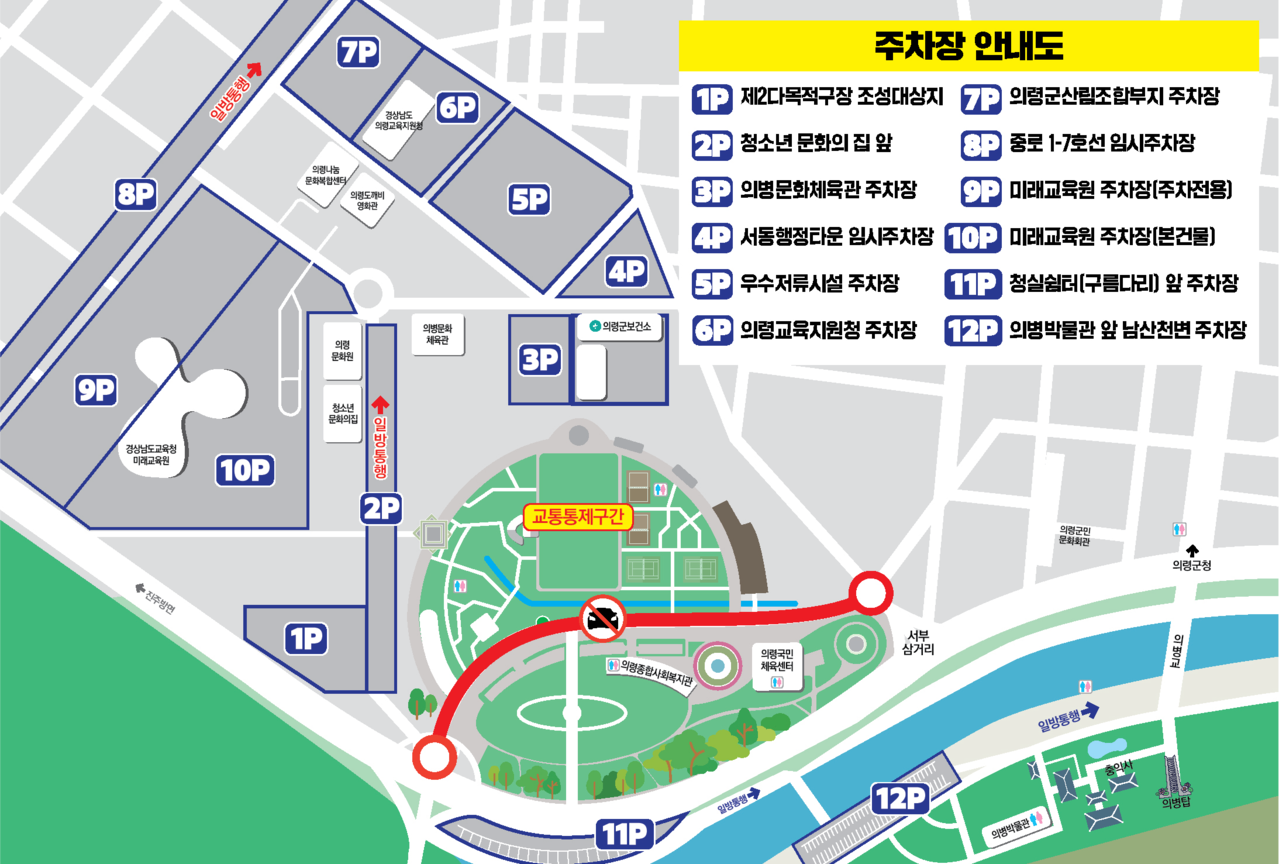 의령군민공원 인근에 임시 주차장 12곳이 운영됩니다.