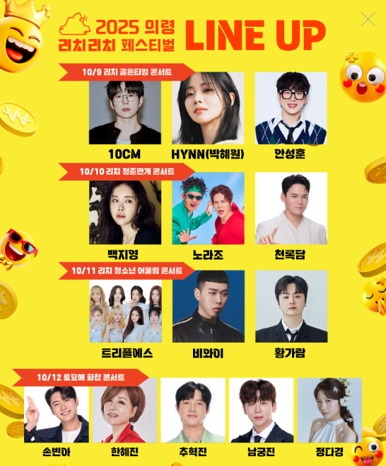 - 10/9(목) 리치 골든타임 콘서트 : 10CM, HYNN(박혜원), 안성훈