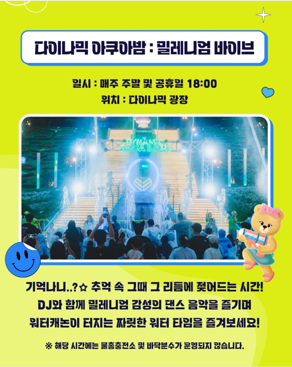 - 특징: DJ와 함께하는 밀레니엄 감성의 댄스 음악과 워터캐논이 어우러지는 자릿한 워터 타임
