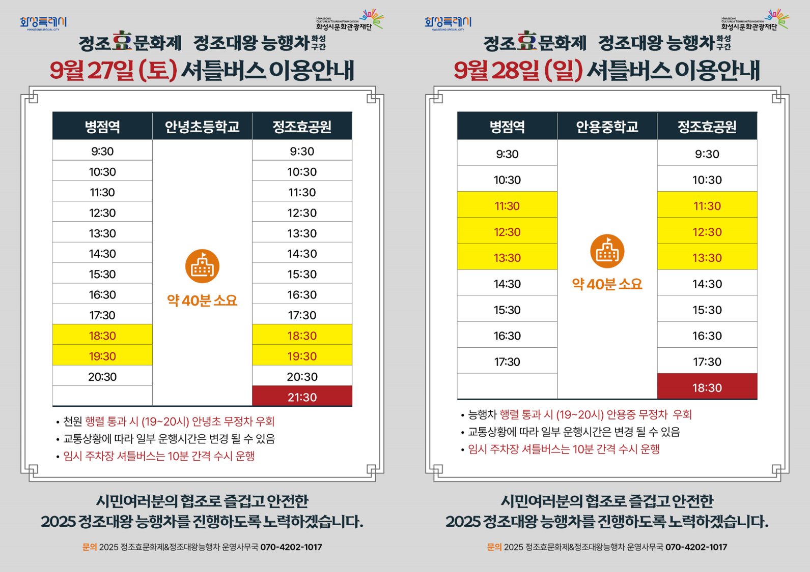 | 9.27 (토) | 병점역 ↔ 안녕초 ↔ 정조효공원 | 09:30 ~ 21:30 (약 40분 간격) |