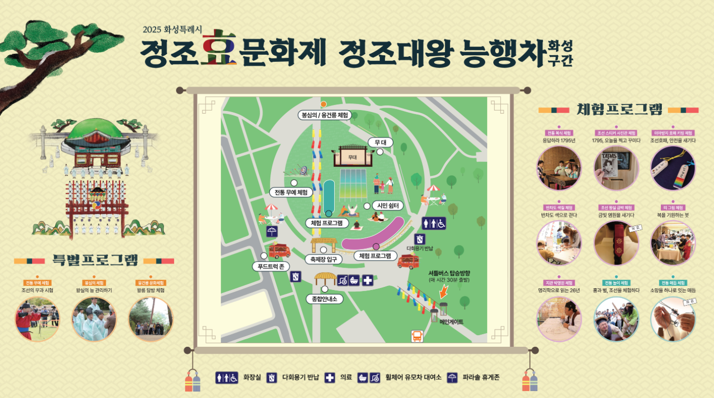- 주요 프로그램: 현륭원 천원 재현, 정조대왕 능행차, 드론라이트쇼, 화성효행잔치, 체험 프로그램, 공연