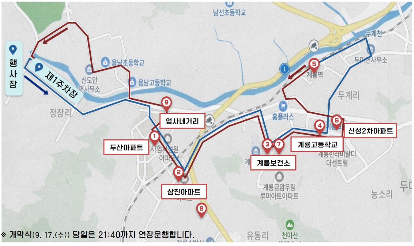 - 경유지: 행사장 → 두산아파트 엄사네거리 → 삼진아파트 → 계룡보건소 → 계룡고교 신성2차 → 계룡역 → 순환