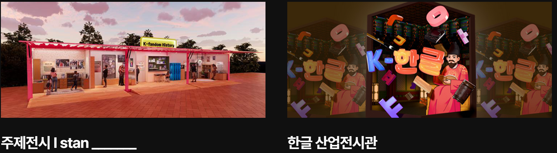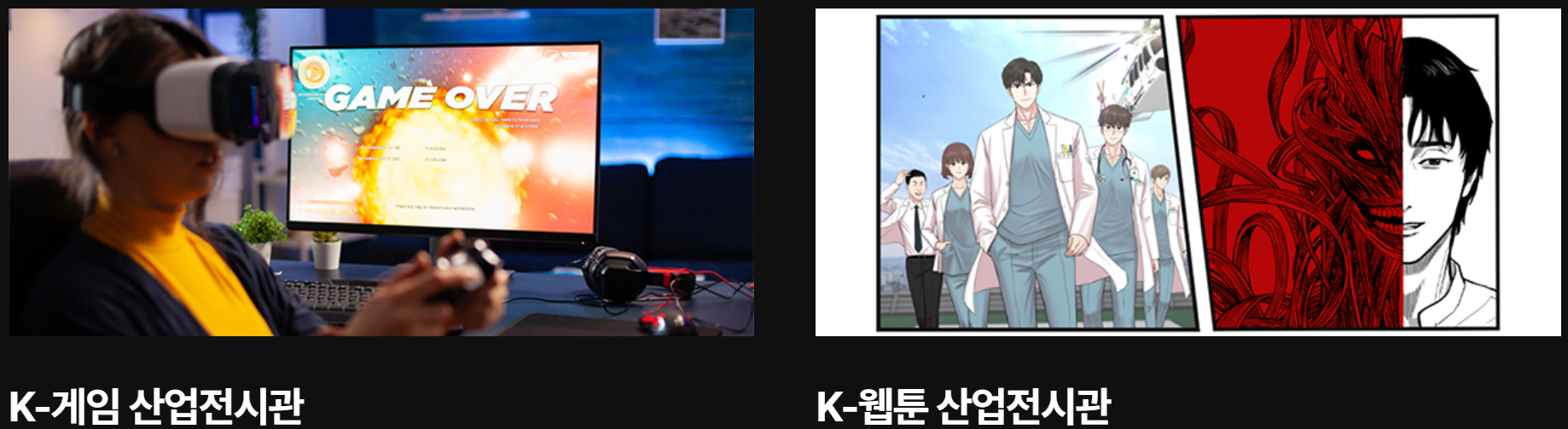 - K-게임 산업전시관: K-게임 역사 특별전, 보드게임, VR게임, AI게임 캐릭터 모델링, 프로젝트 맵핑+3D스캐너 체험 / 10:00~18:30 (폐막일10:00~16:00) / 독립기념관 입구(셔틀버스 정류장 옆) TFS텐트
