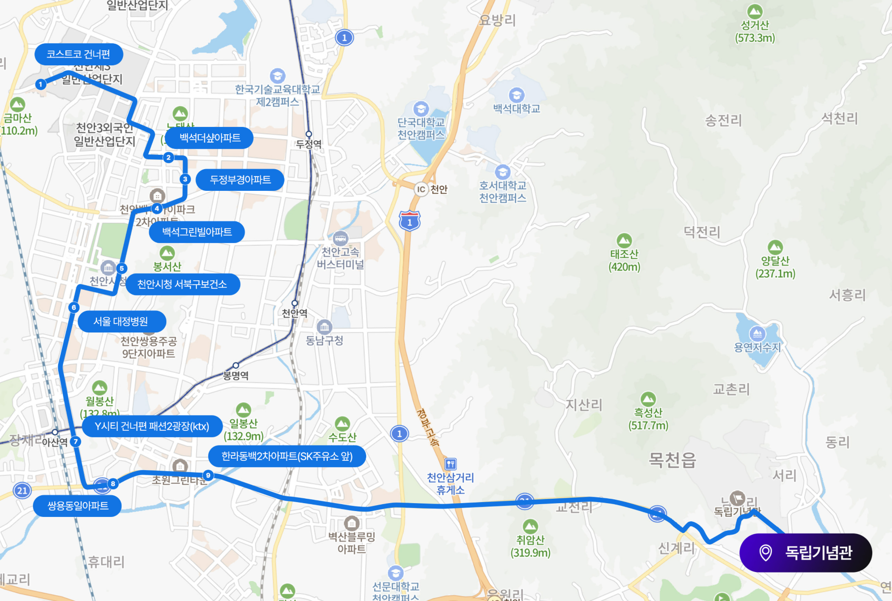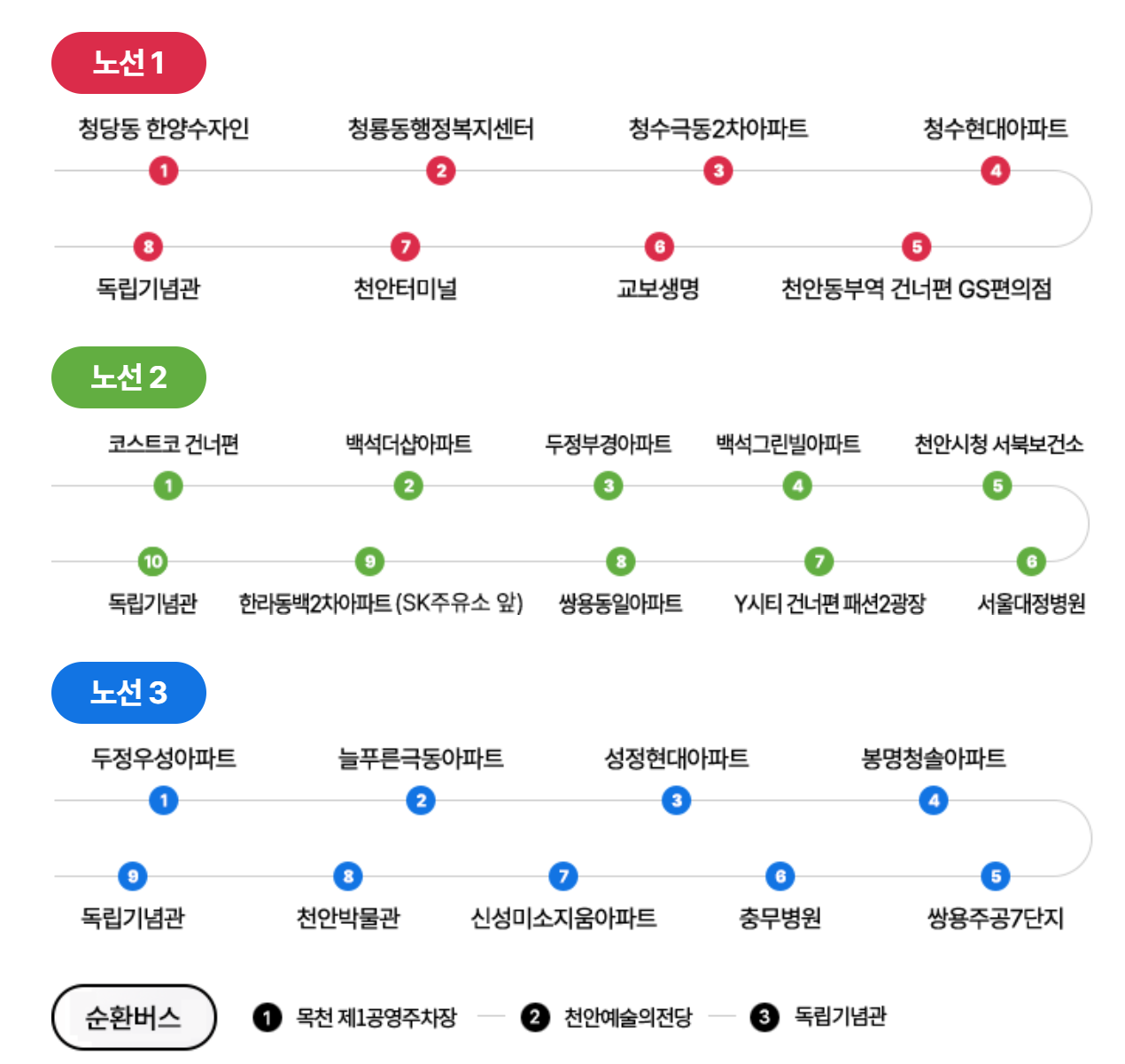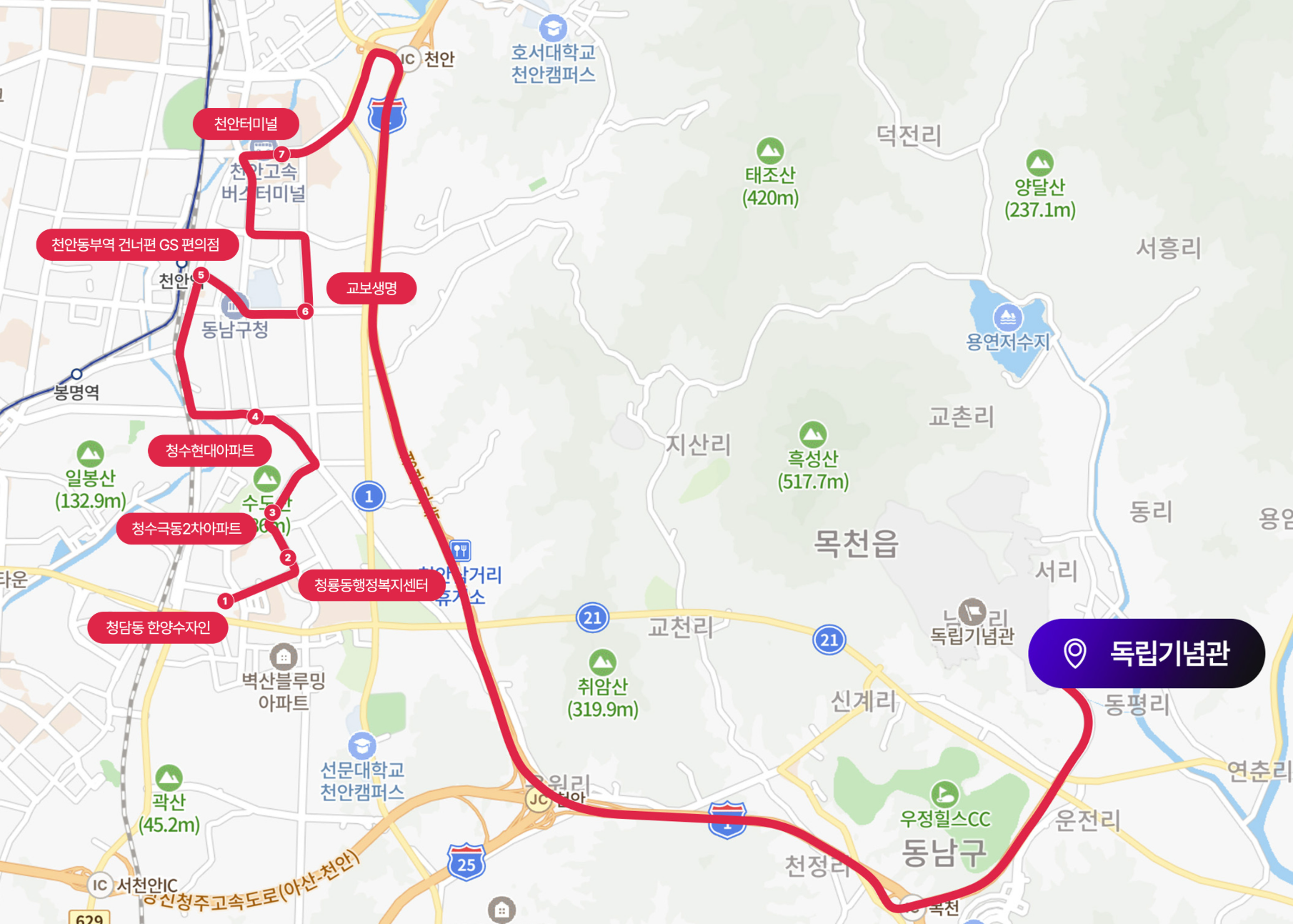 - 시외버스: 천안종합터미널 하차 후 셔틀버스 이용