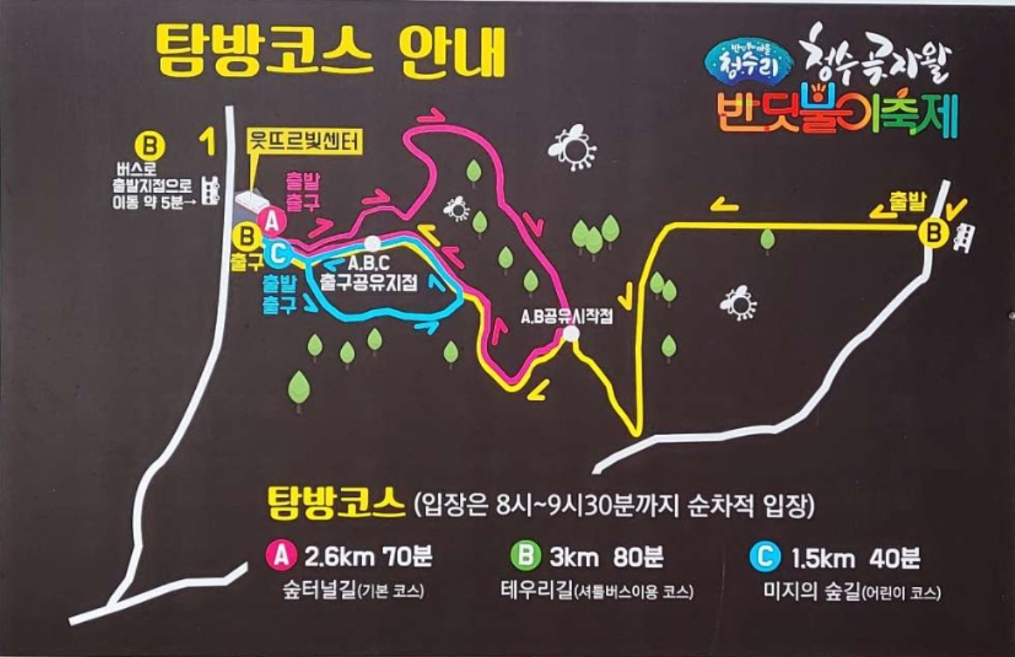 - A코스: 2.6km / 약 70분 소요 / 숲터널길