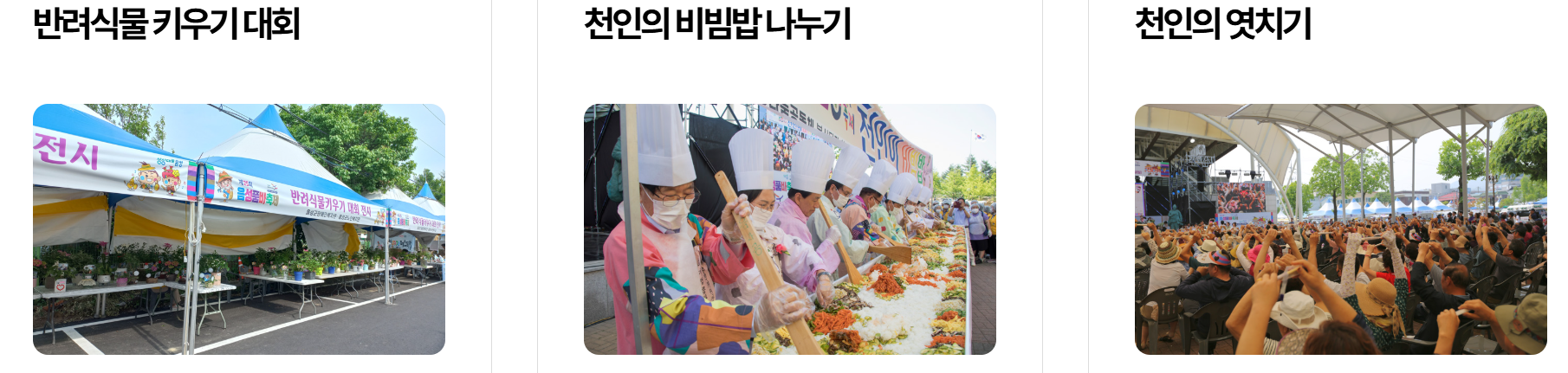 - 천인의 비빔밥 나누기: 음성품바축제의 정체성인 사랑과 나눔의 대표 프로그램. 관광객과 비빔밥을 나누어 먹는 행사