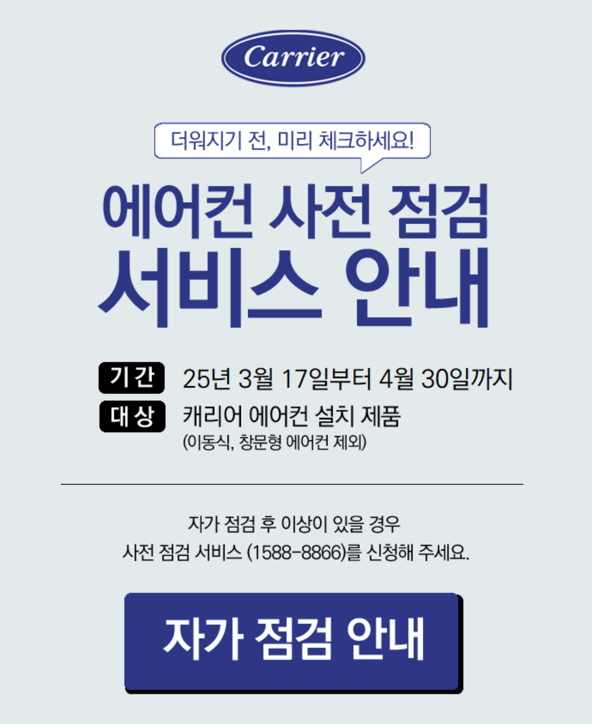 캐리어는 고객의 편안한 여름을 위해 3월 17일 부터 4월 30일까지 사전점검 무료 서비스를 제공하고 있습니다. 이 서비스는 에어컨의 성능을 최적화하고, 고장을 예방하기 위한 점검을 포함합니다. 특히, 여름철에 에어컨을 자주 사용하게 되므로, 미리 점검하여 문제를 예방하는 것이 중요합니다.