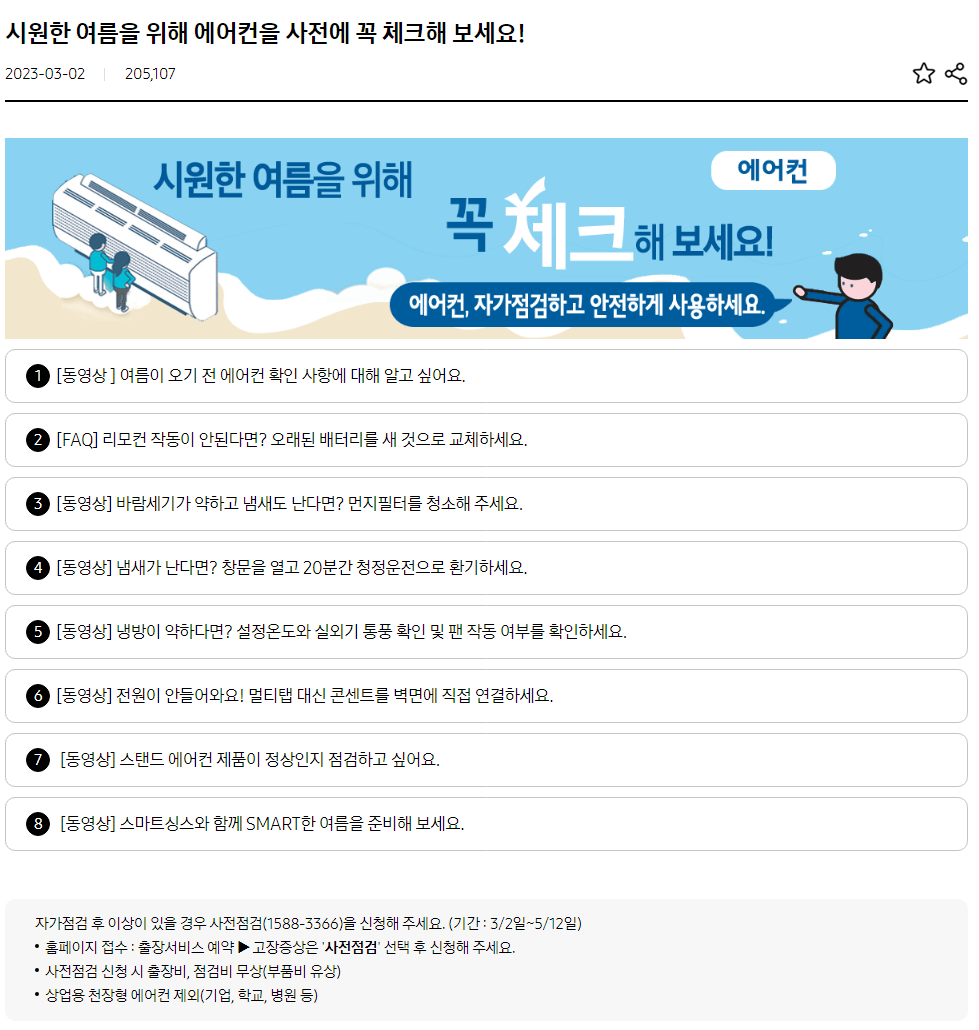 여름철 에어컨 사용을 위해 사전점검 서비스를 꼭 신청하시기 바랍니다. 여러분의 쾌적한 여름을 위해 준비하세요! 😊