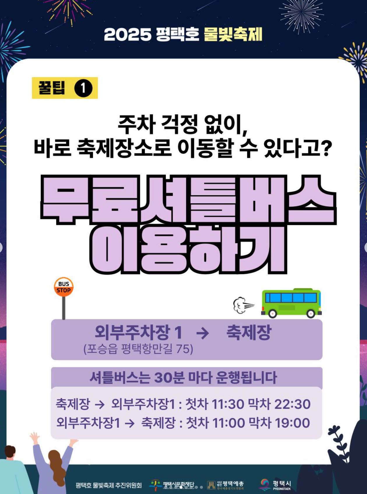 - 무료 셔틀버스: 외부 주차장 ↔ 축제장 30분 간격 운행