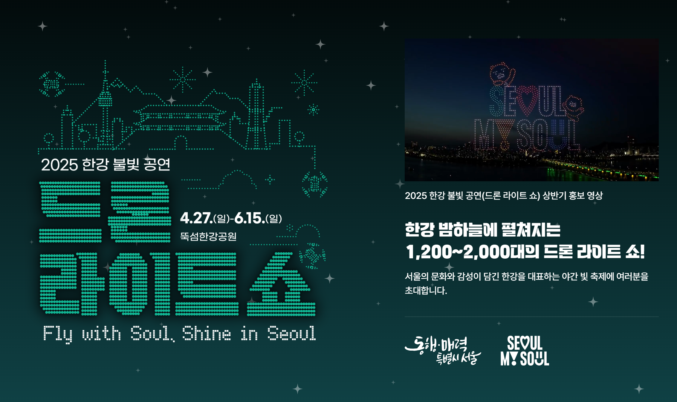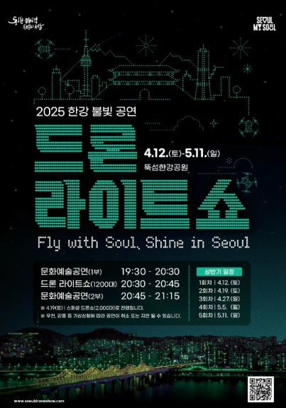 2025년 드론 라이트쇼는 "Fly with Soul, Shine in Seoul"이라는 주제로 진행됩니다. 이 공연은 서울의 아름다운 야경과 함께 드론의 화려한 불빛을 통해 관람객들에게 잊지 못할 경험을 선사할 것입니다. 드론 2,000대가 하늘을 수놓으며, 다양한 테마의 공연이 펼쳐질 예정입니다.