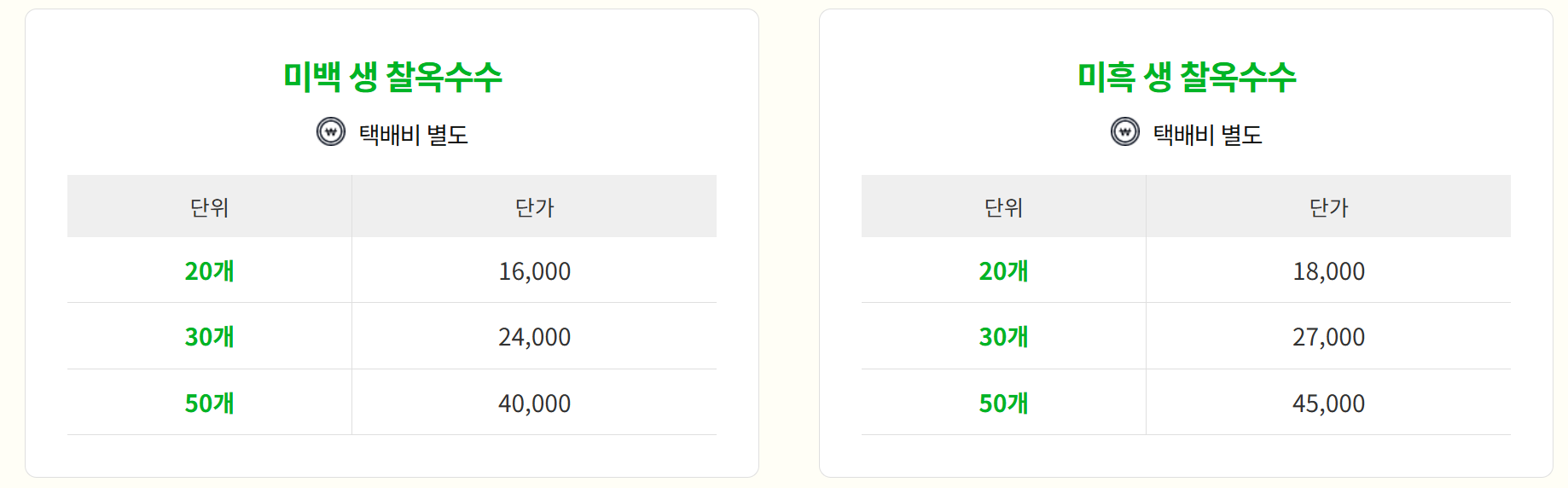 미백 옥수수는 부드럽고 소화가잘되는 특징이, 미흑 옥수수는 과채가 얇고 식감이 좋은 특징이 있습니다. - 찰옥수수 가격 :