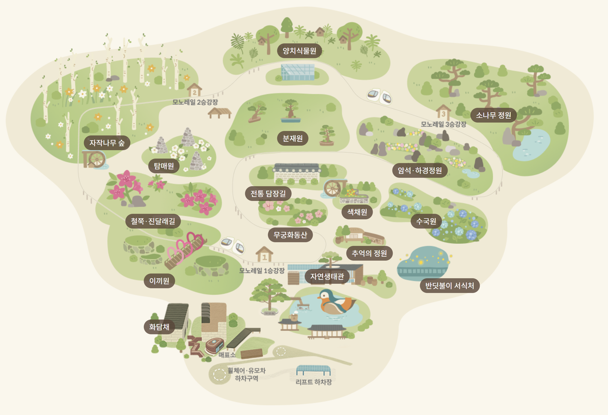 - 모노레일 코스 : 숲의 전경을 한눈에 볼 수 있는 모노레일을 이용한 코스입니다.