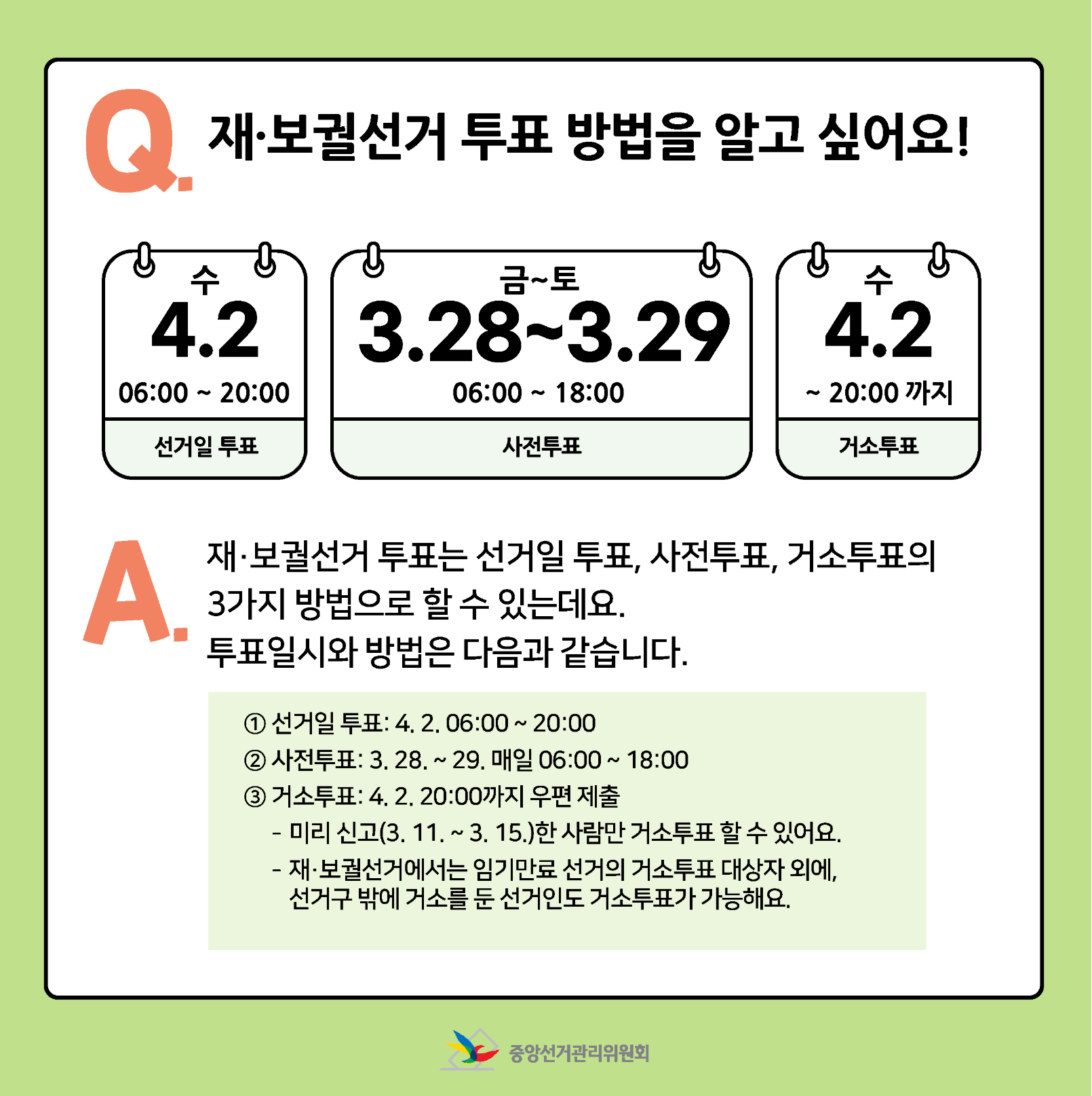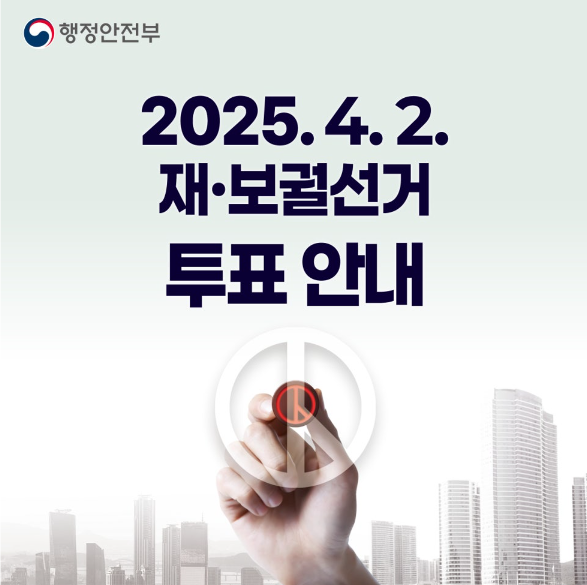 재보궐선거는 특정 지역의 공직자가 사망, 사퇴, 또는 기타 사유로 인해 공석이 되었을 때 실시되는 선거입니다. 2025년 4월 2일 수요일에 실시될 예정이며, 이 날은 오전 6시부터 오후 8시까지 투표가 가능합니다.
