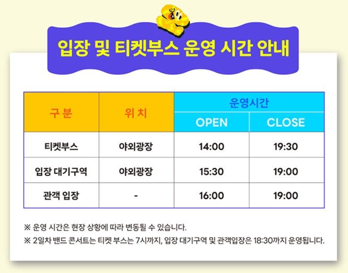 - 준비물: 야외 공연의 경우 날씨에 대비한 우비나 모자 등을 준비하세요.