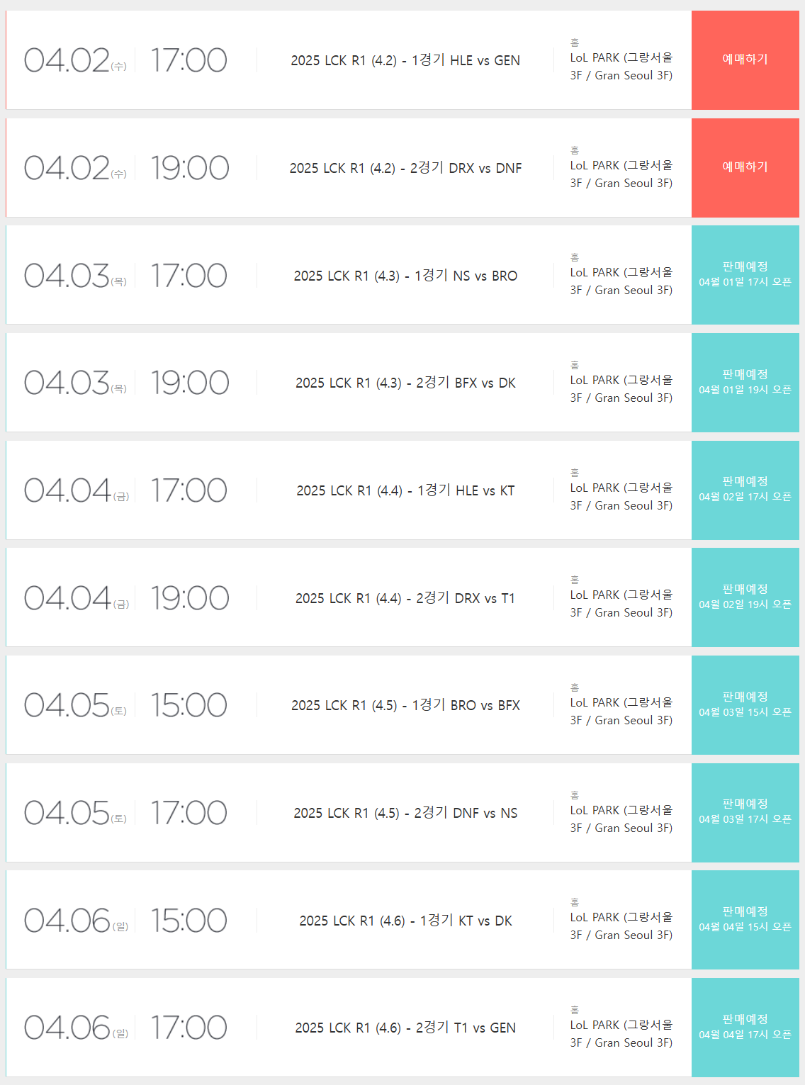 특히, 4월 2일에는 HLE와 GEN의 첫 경기가 열리며, 티켓은 3월 31일 오후 5시에 오픈됩니다. 이런 중요한 경기는 놓치지 말고 예매하세요!