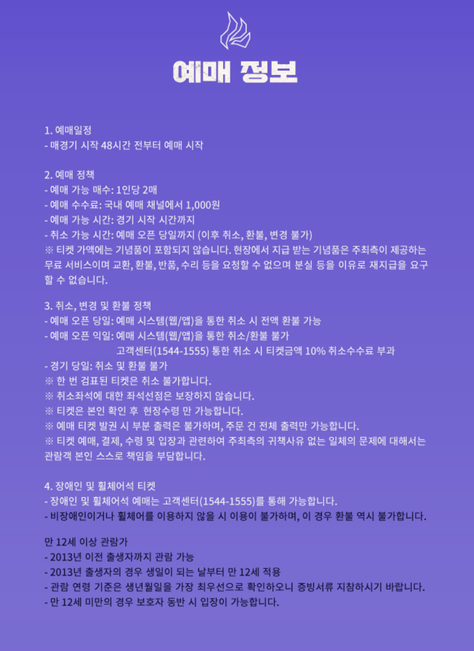 - Q: 티켓 환불은 가능한가요? A: 일반적으로, 경기 일정 변경이나 취소가 있을 경우 환불이 가능합니다. 하지만 개인적인 사정으로 인한 환불은 불가능하니 주의하세요.