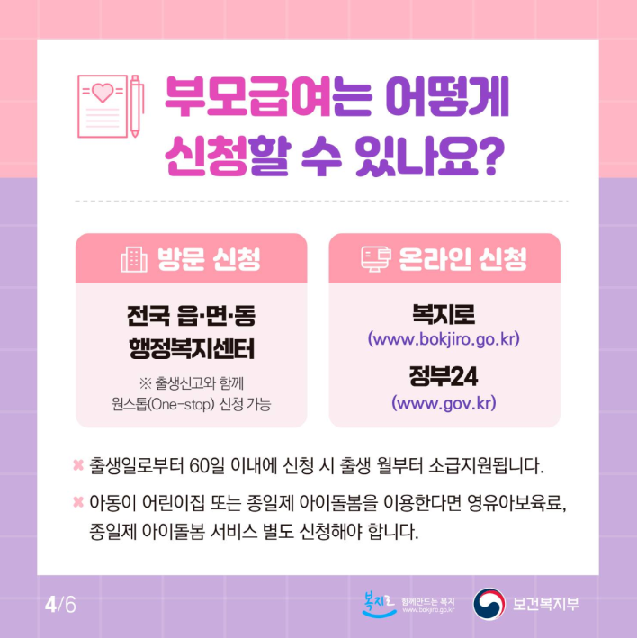 경로 : 복지로 로그인 → 복지서비스 신청 → 복지급여 신청 → 영유아 → 부모급여
