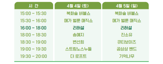 | 걸어다니는 마술사 공연 | 4월 4일~5일 10:00~18:00 | 벚꽃길 따라 걷다 만나는 깜짝 거리 마술 |