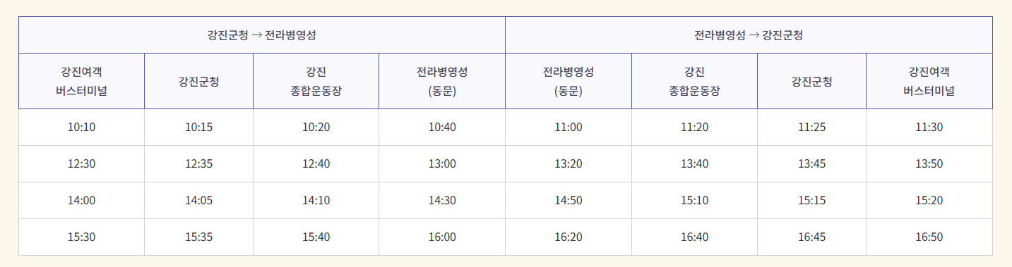강진여객 버스터미널, 강진군청, 강진 종합운동장에서 탑승 가능
