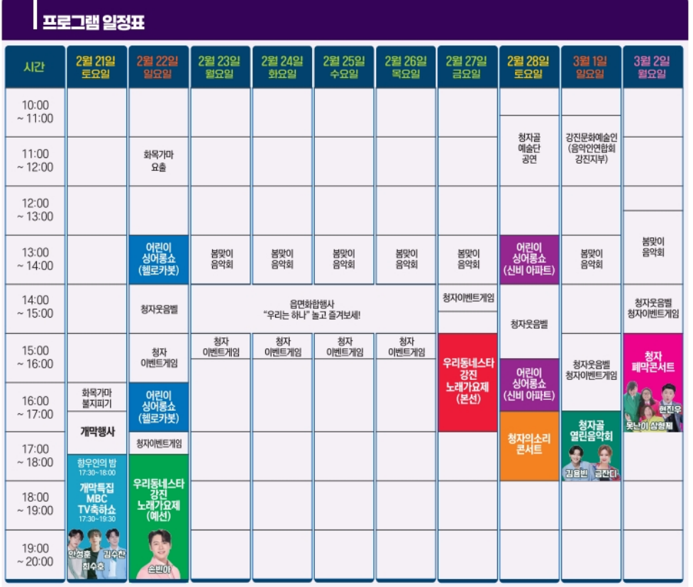 | 2월 21일(토) 18:00 | MBC 개막축하공연 | 안성훈, 최수호, 서지오, 김수찬, 미스김 |