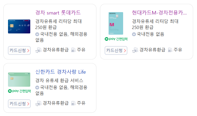 | 발급카드 | 롯데·신한·현대카드 유류구매카드 |