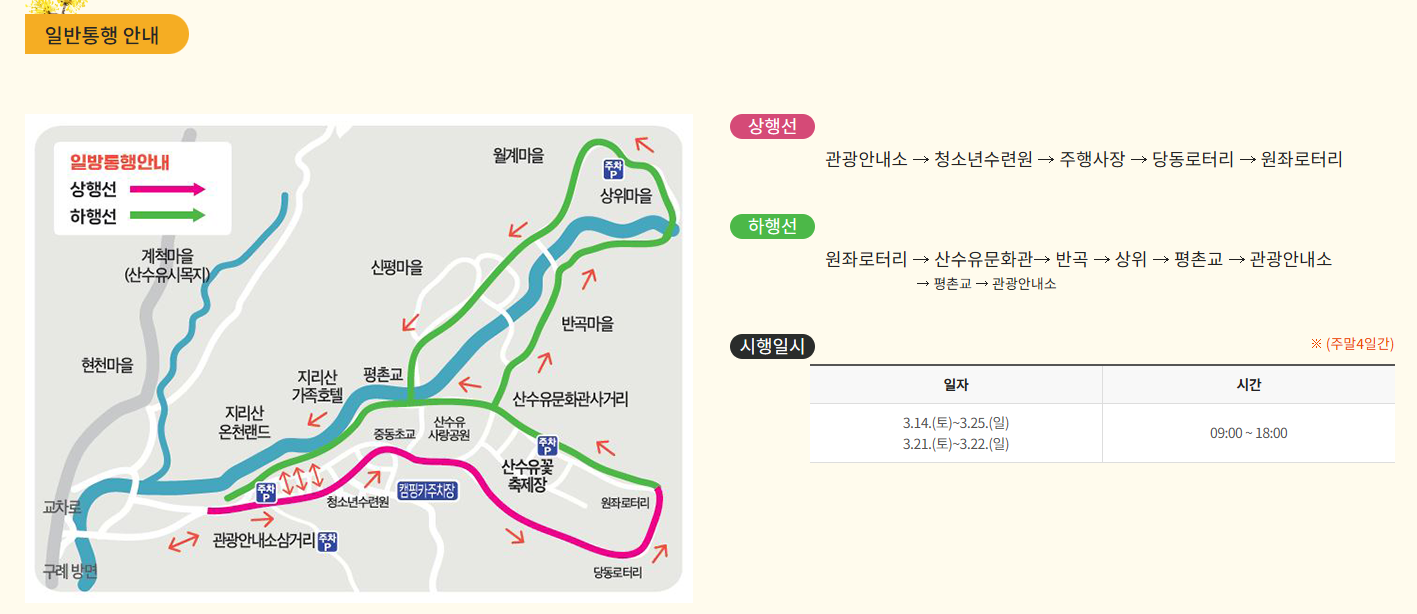 공식 주차장: 산수유문화관, 관산운동장, 산수유사랑공원 인근