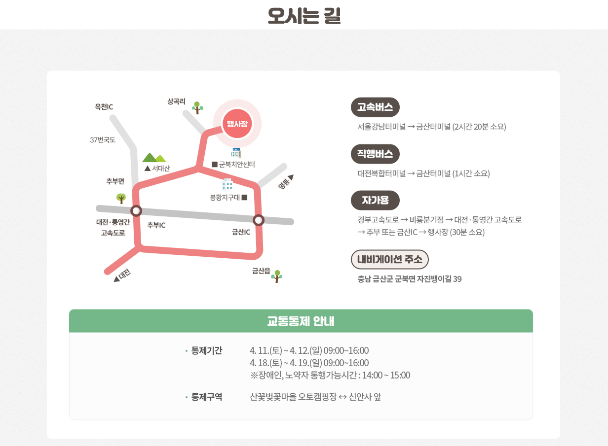 | 자가용 | 경부고속도로 → 비룡분기점 → 대전·통영간 고속도로 → 추부 또는 금산IC | 약 30분 |