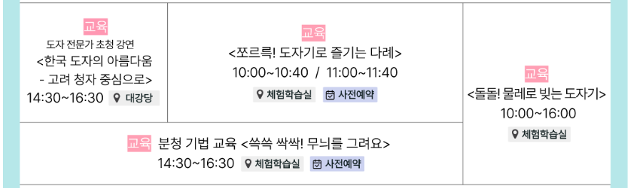 | 사전예약 필수 | 공룡애니멀쇼, 촛불음악회, 분청기법 교육, 다례 교육 |