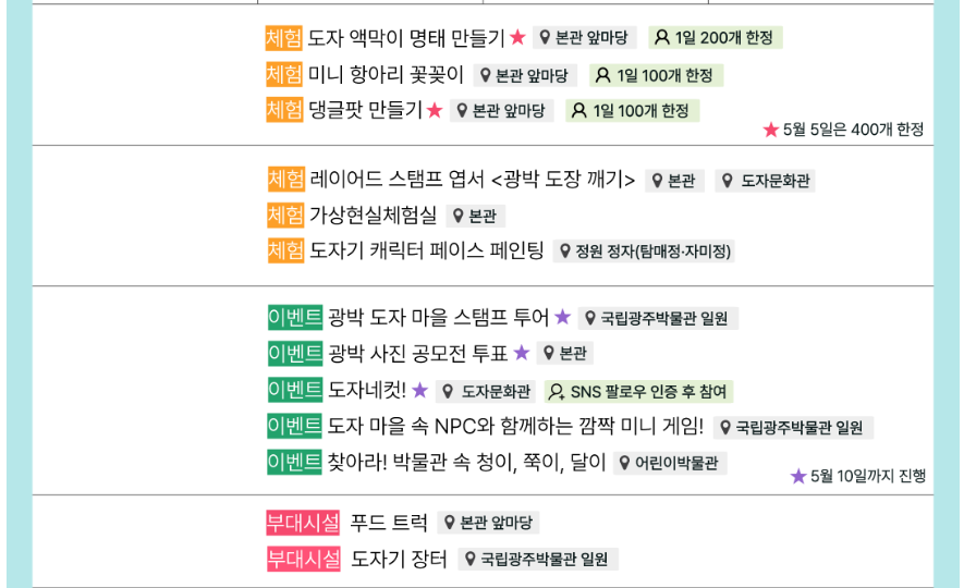 ✔ 사전예약 필수 : 공룡애니멀쇼(5/3), 촛불음악회(5/4), 분청기법 교육, 다례 교육