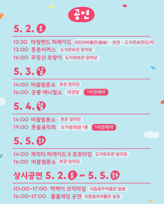 ✔ 주요 공연 : 동춘서커스, 버블벌룬쇼, 마칭밴드 퍼레이드, 무등산 호랑이