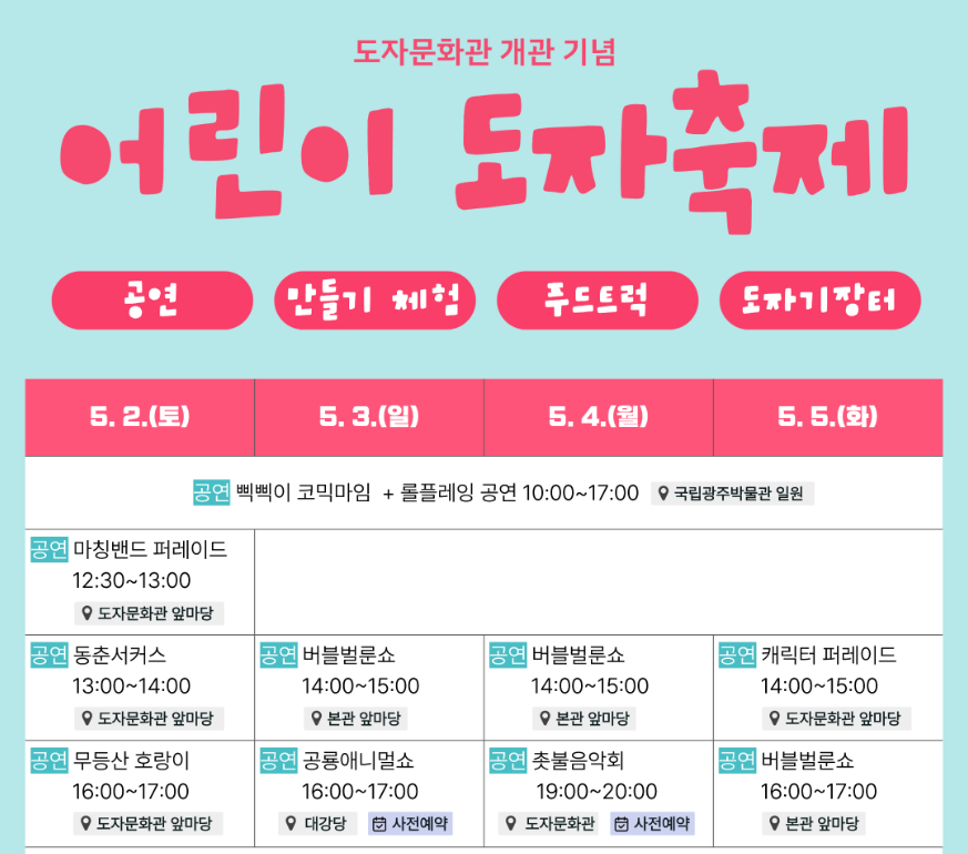 | 만들기 체험 | 당일 현장 접수, 선착순 마감 (일찍 가야 함) |