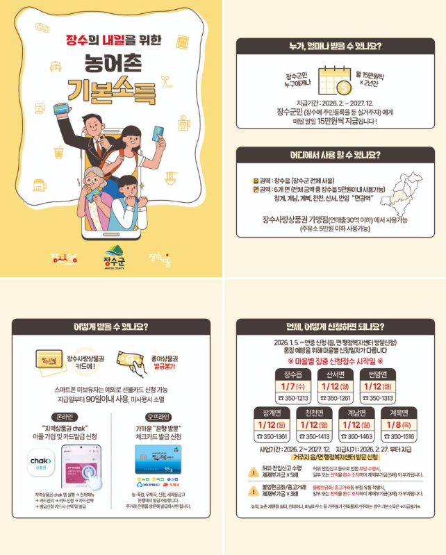 ✨ 한눈에 보는 요약정부가 2026~2027년 동안 추진하는 농어촌 기본소득 시범사업에서전국 7개 군이 최종 선정되었다.선정 지역 주민은 매월 15만 원을 **지역사랑상품권(카드형)**으로 지급받는다.
