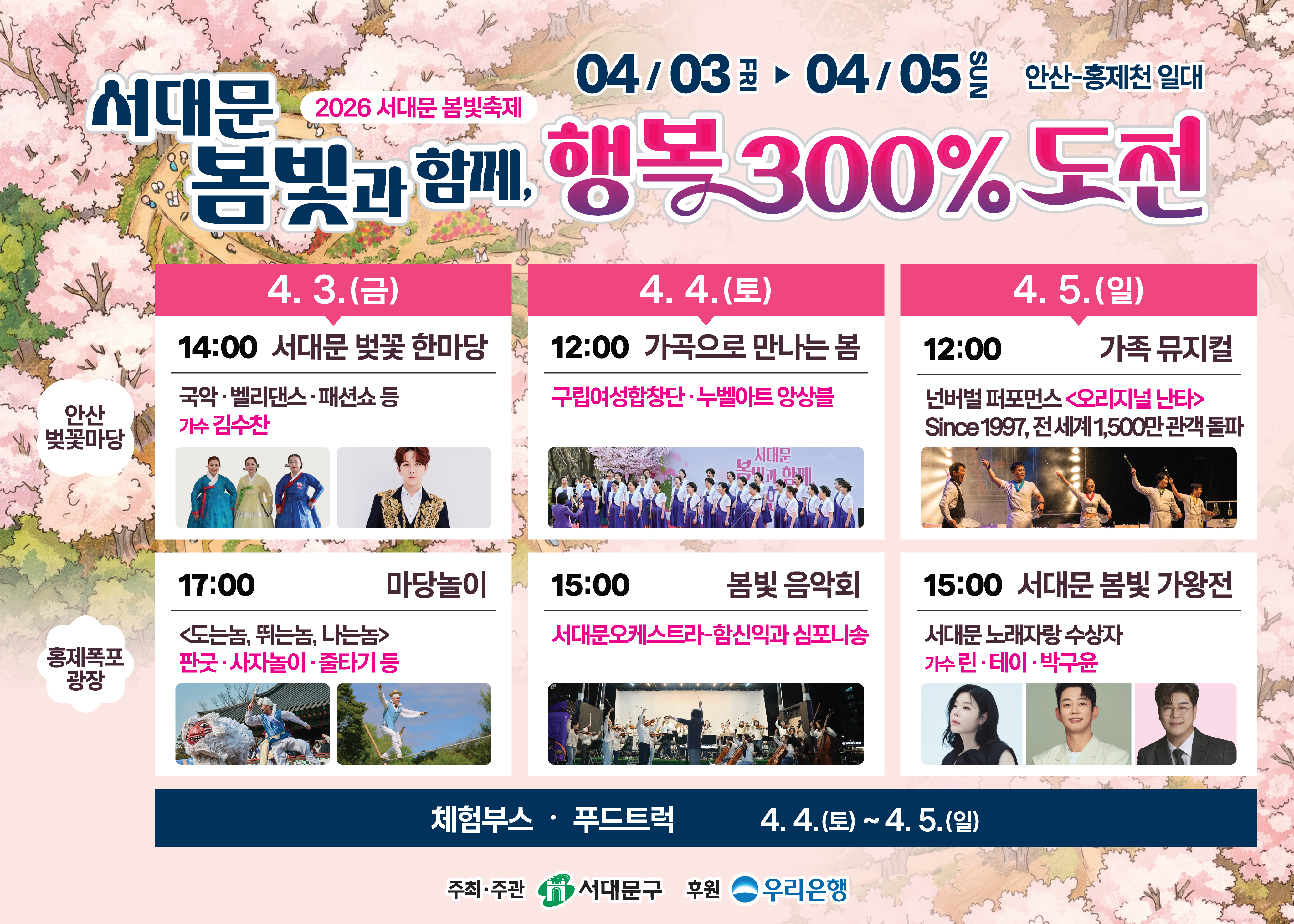 안산 벚꽃길과 홍제천을 배경으로 서대문 벚꽃 한마당, 마당놀이, 봄빛 음악회, 서대문 봄빛 가왕전, 체험부스, 푸드트럭 등
