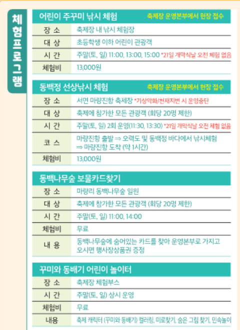 | 체험거리 | 물고기체험(잉어·금붕어잡기), 연날리기 체험, 동백꽃 키링 만들기, 모두 동백꽃 만들기 체험 |