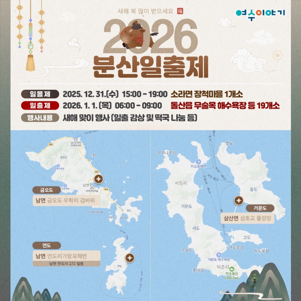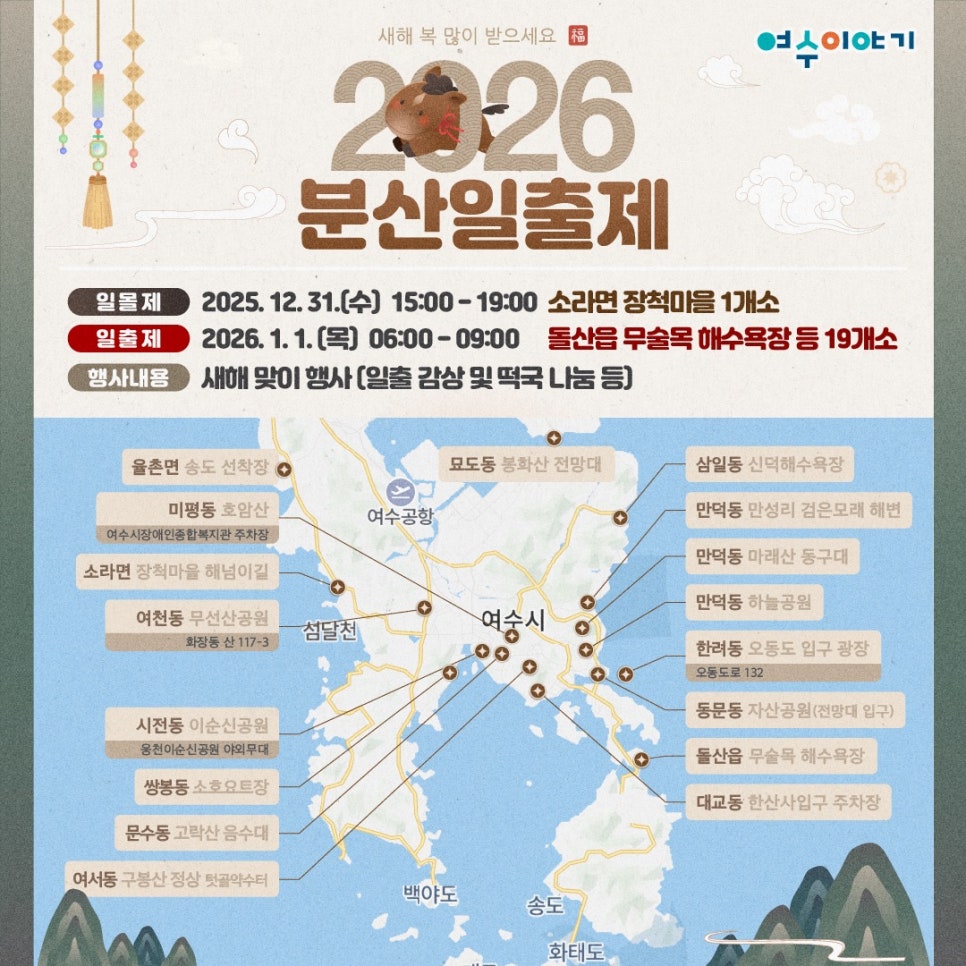 | 일출제 | 2026.01.01(목) | 06:00 ~ 09:00 | 돌산·여수 전역 19곳 |