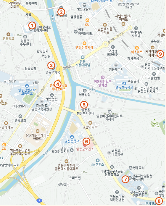 | ⑨ | 영동군청 | 충북 영동군 영동읍 동정로 1 |