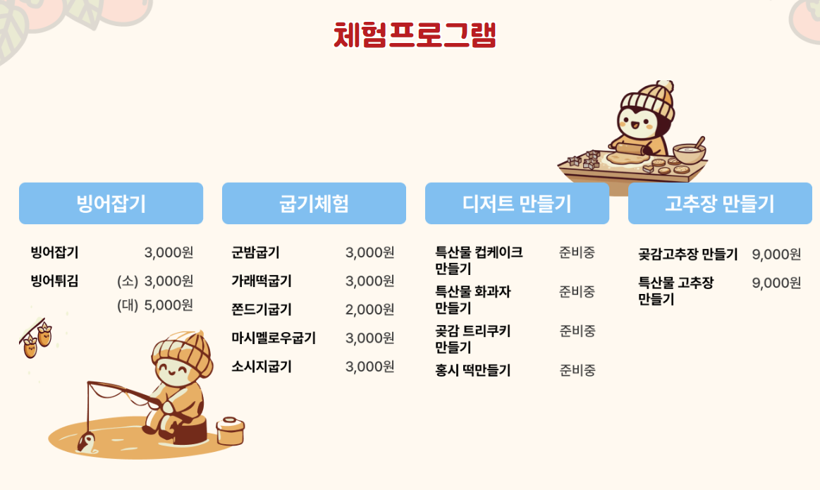| 🧑🍳 체험행사 | 곶감 화과자·고추장 만들기, 군밤·군고구마 체험 등 |