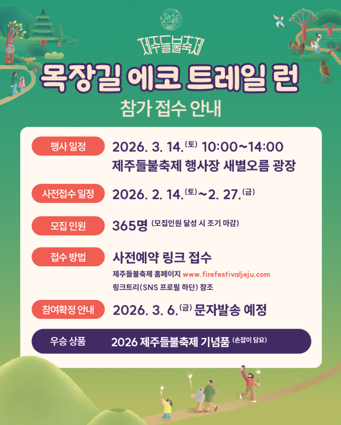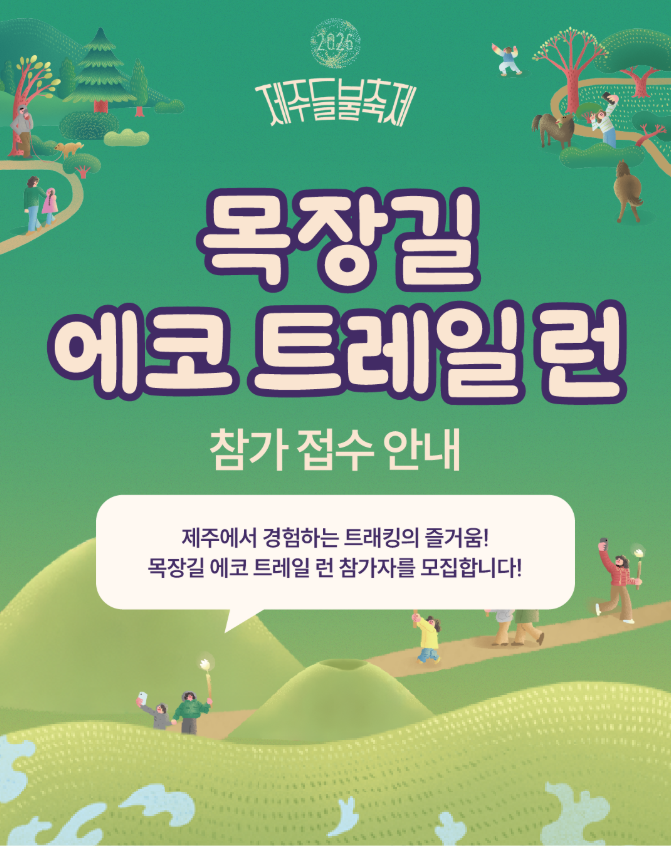 | 제주 목장길 에코 트레일런 | 3. 14.(토) 10:00~14:00 | 새별오름·이달오름 일원 |
