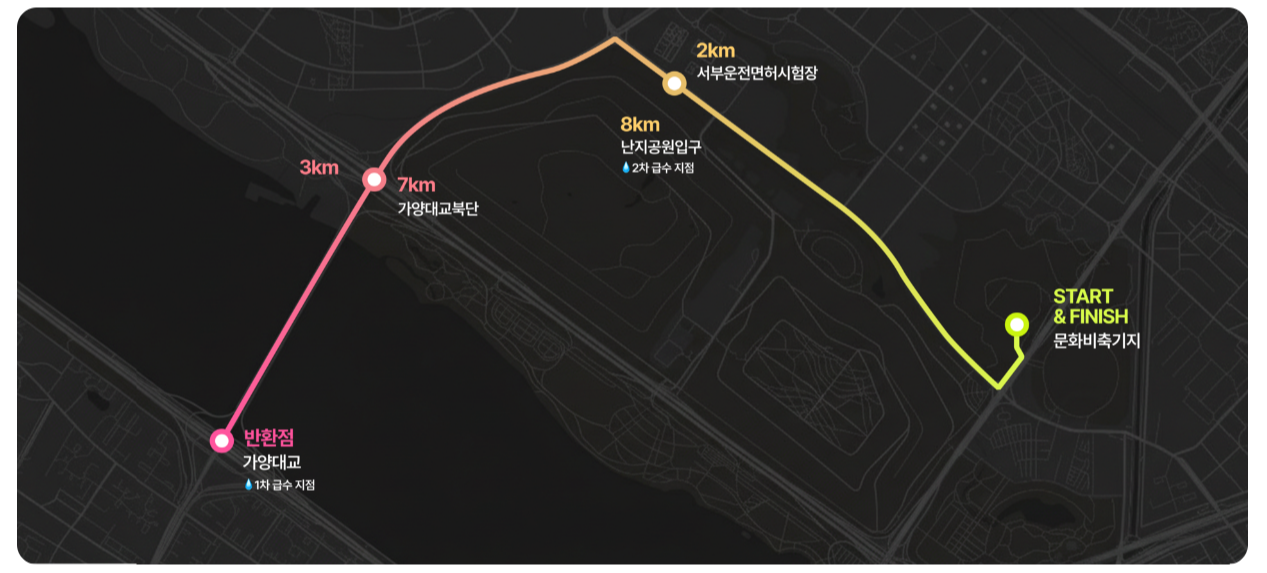 코스 - 문화비축기지(출발) → 가양대교(5km 지점 반환) → 문화비축기지(도착)