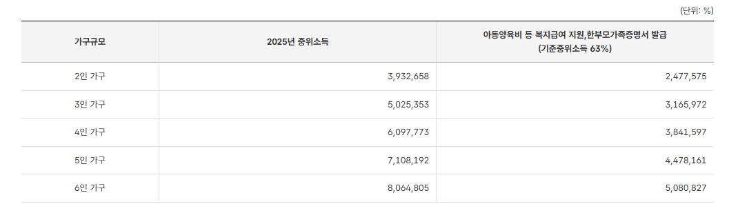 📊 한부모가족 소득 기준표
