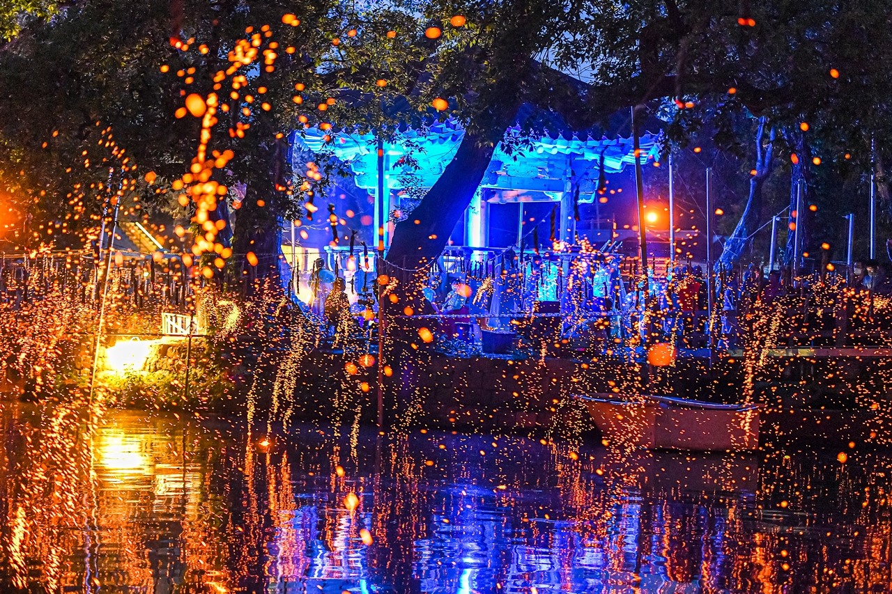 바람의 강약에 따라 떨어지는 불꽃이 무진정 연못을 수놓는 장관이 펼쳐집니다.