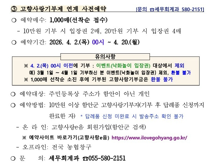 3. 고향사랑기부: 4월 2일~20일 기부 (선착순 1,000매)