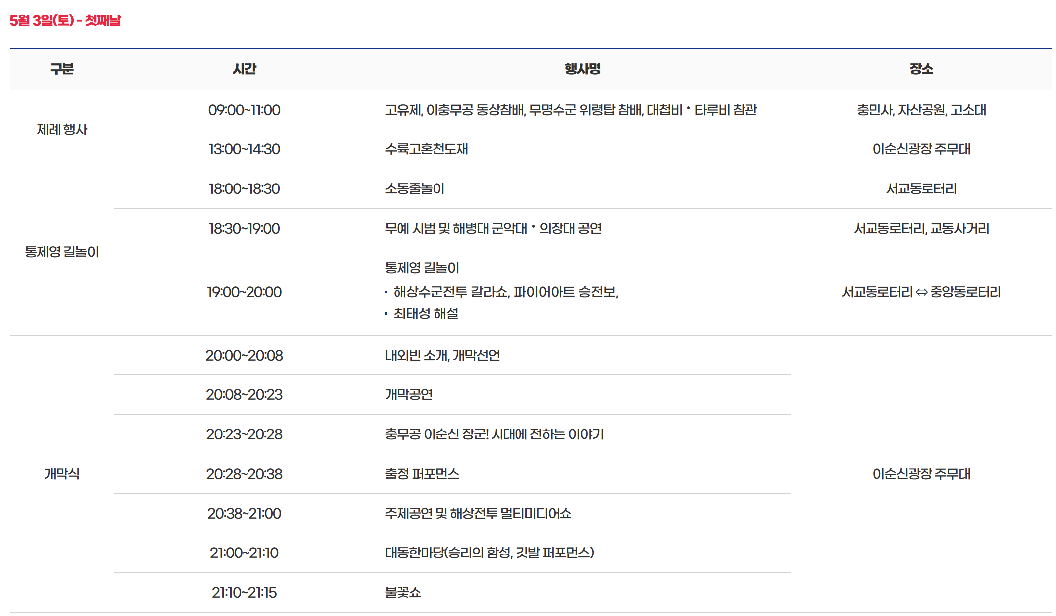 - 주요내용 : 통제영길놀이, 개막식, 해상 수군 전투 멀티미디어쇼, 각종공연 및 체험행사