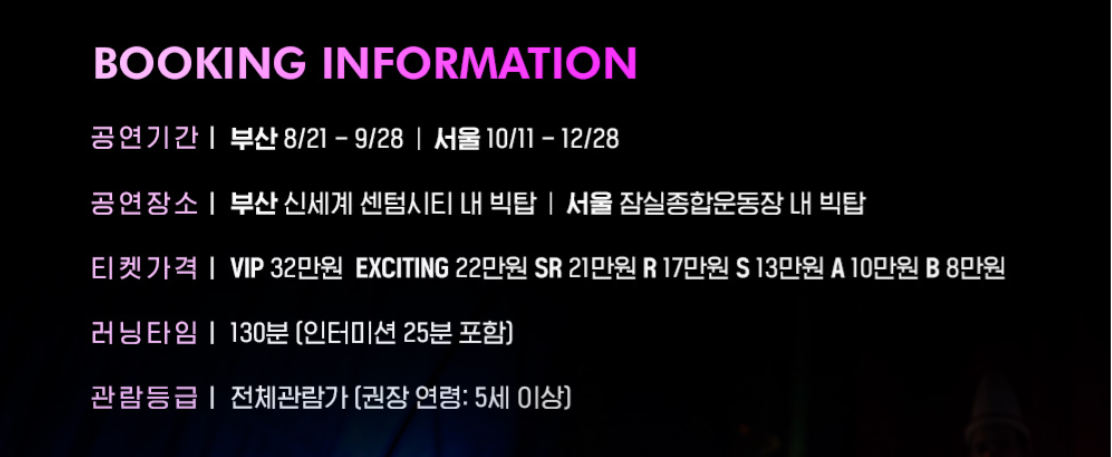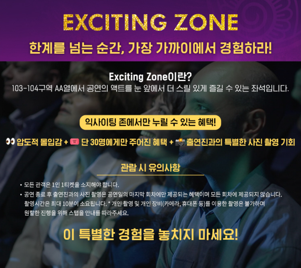 - 좌석 선택: 공연의 역동적인 퍼포먼스를 가까이에서 느끼고 싶다면 중앙 좌석을 추천합니다.