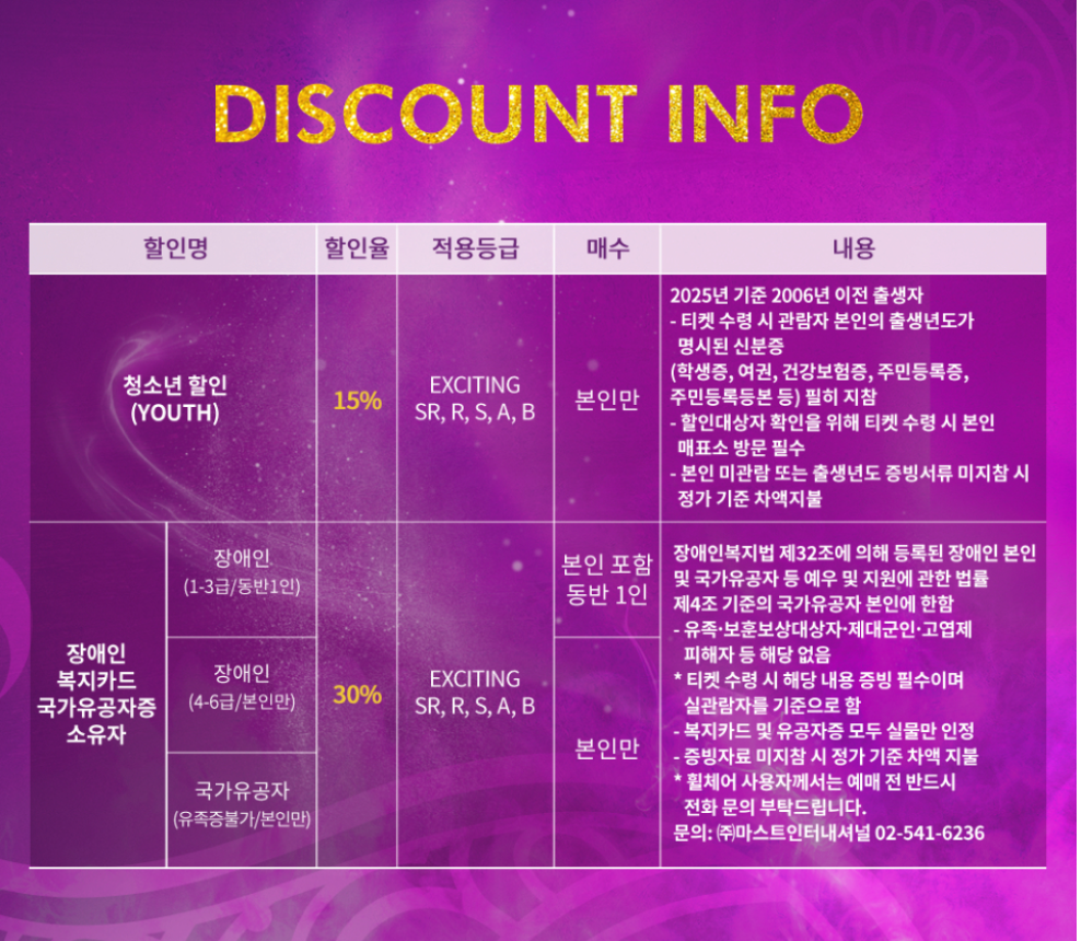 - ※ 10월15일(수) 7시30분 공연에 한해 101, 102 구역의 일부 좌석이 SR석으로 판매됩니다.