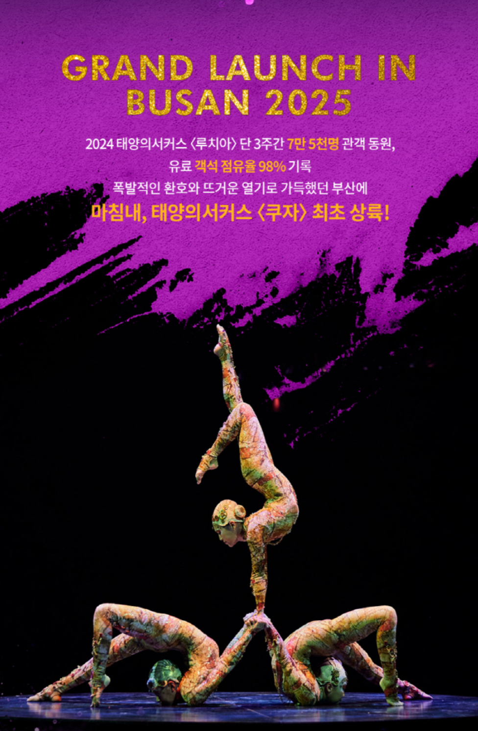 7년 만에 한국을 찾는 태양의서커스 ‘쿠자’는 아크로바틱과 스토리텔링이 어우러진 공연으로, 가족, 연인, 친구와 함께 감동적인 시간을 보내기에 안성맞춤입니다. 지금 바로 예매해 이번 기회를 놓치지 마시고, 잊지 못할 추억을 만들어보세요!