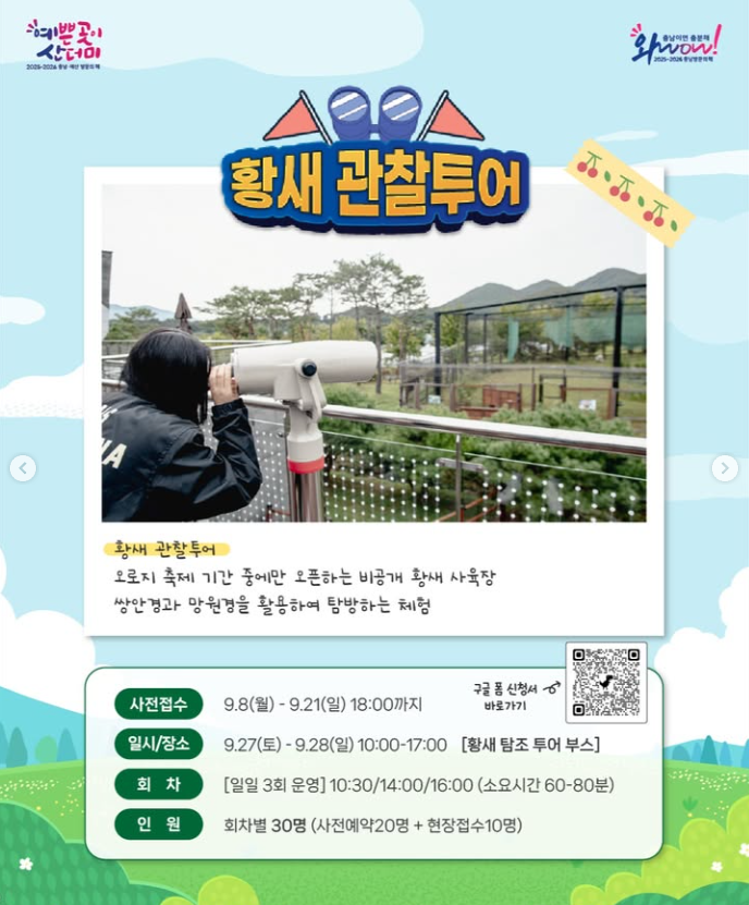 | 황새 관찰투어 | 9.27~28 (10:30/14:00/16:00) | 비공개 황새 사육장 탐방 & 망원경 체험 |