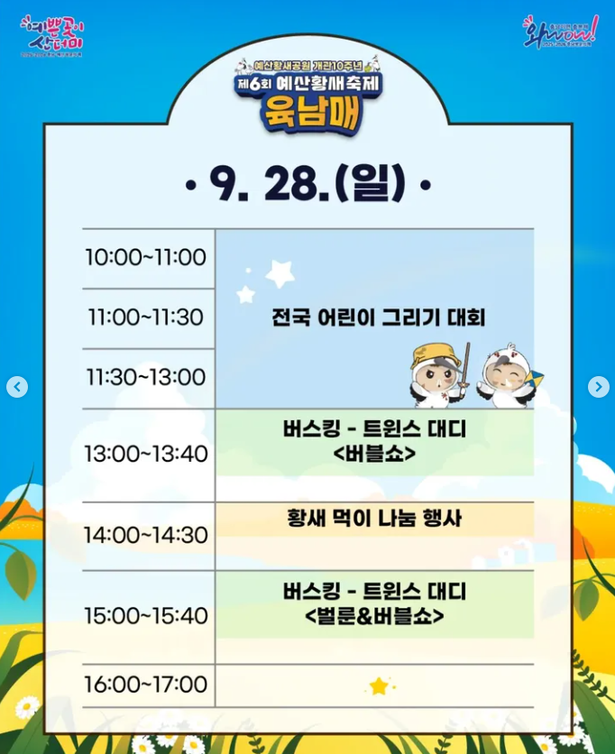 | 전국 어린이 그림대회 | 9.28 (10:00~13:00) | 유아/초등부 대상 현장 그림 대회 |