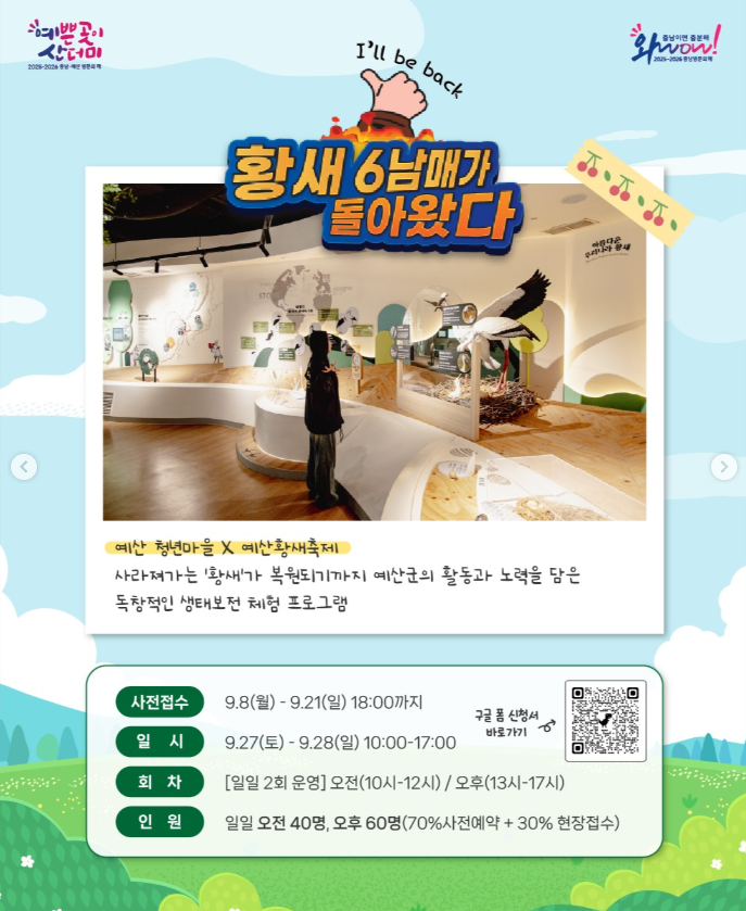 | 황새 6남매가 돌아왔다 | 9.27~28 (10:00~17:00) | 황새 복원 과정을 담은 특별 체험 전시 |