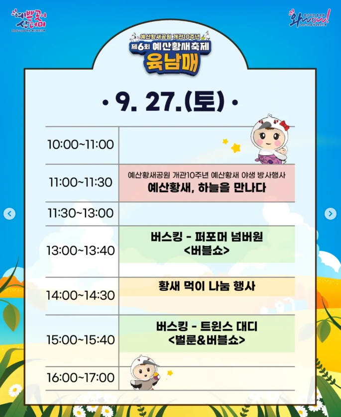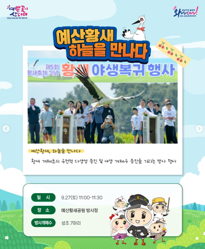 | 예산황새, 하늘을 만나다 | 9.27 (11:00~11:30) | 황새 방사 행사 (성조 7마리) |
